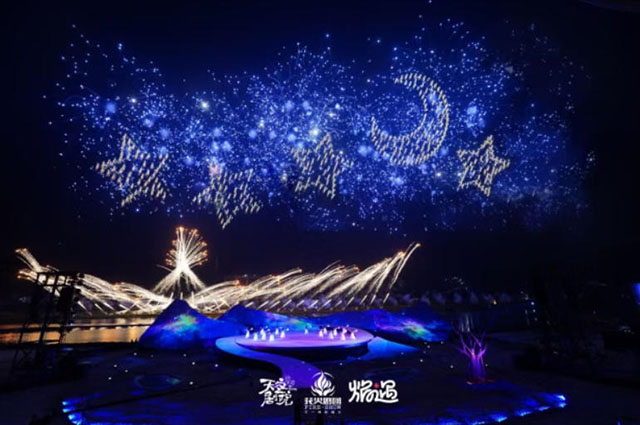 此次活动最引人注目的创新,在于突破传统烟花表演的时间边界——不同于天空剧院常规夜间燃放模式,本次特别将燃放时长延伸至昼夜双时段:蓝调时刻,创意彩烟以莫奈风色彩勾勒天空画卷,打破“烟花只属夜晚”的固有认知;夜幕降临时,全新“天幕焰火”以天空为阵地高难度环绕绽放,配合灯光与沉浸式音效,让浏阳河从昼到夜化作绝美舞台。这种昼夜联动的呈现方式,正是“焰遇”IP对传统花炮文化的创新性表达。