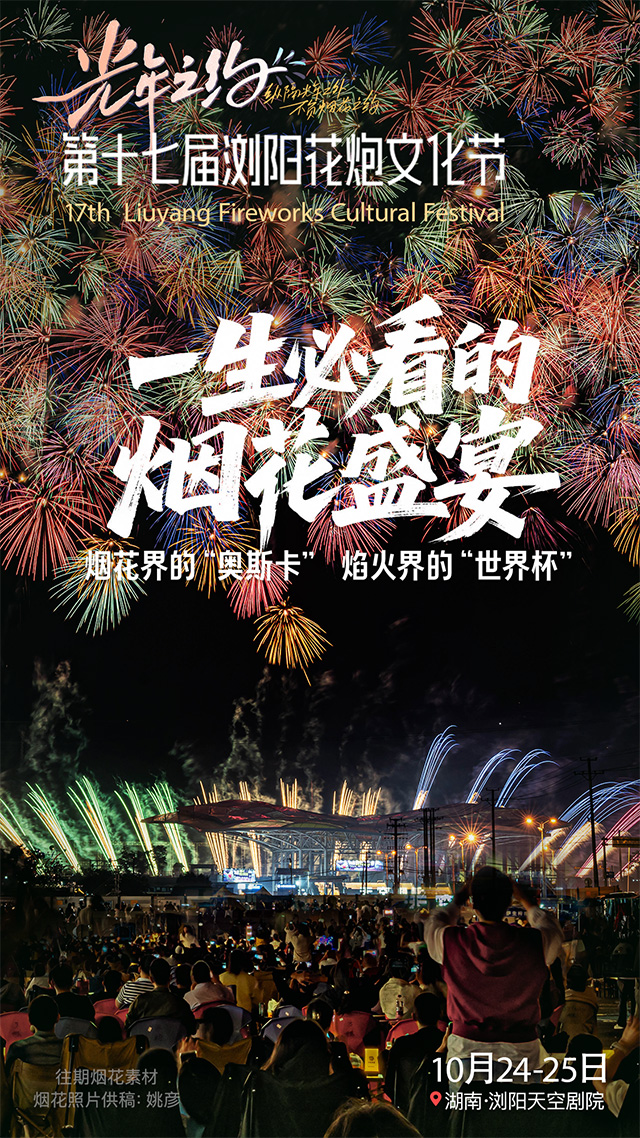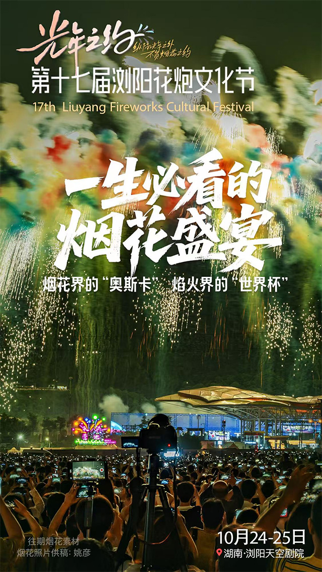 第十七届浏阳花炮文化节定档10月24日-25日,将以“光年之约”为主题,突出国际范、科技感和文化味,创新推出六大主体活动,演绎宝藏级的千年文化,点亮百亿级的富民产业,绽放现象级的焰火经济。