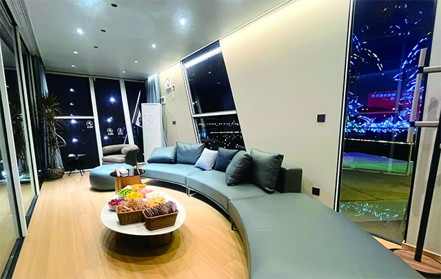 除草坪区外,位于南区商店二楼的包厢在本场焰火秀中首次对外开放,一经推出便被一个37人的长沙旅行团“包场”。游客们或舒适地坐在包厢的沙发上静静欣赏,或走到开阔露台上近距离感受璀璨夜空,现场欢声笑语不断。