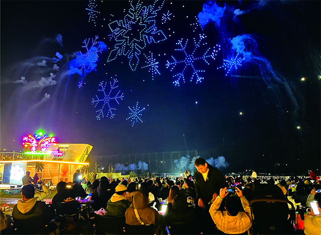 “在天空营地西区,游客可以从远观视角欣赏烟花绽放的全貌,与天空剧院建筑轮廓交相辉映,夜幕衬托下宛如一幅动人的画卷。”唐磊表示,“开阔的草坪布局和自由座席安排,不仅让拍照取景更加自如,更促进了游客间的互动交流,让看烟花成为一种社交体验和情感联结。”