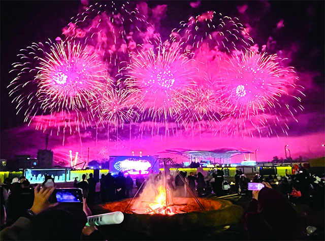 与精致松弛的南区相比,西区则是另一番“燃动”景象。场地中央燃起熊熊篝火,跳动的火焰为冬日的夜晚增添了浓浓暖意,专业乐队的现场驻场演出更让氛围持续升温,游客们跟着节奏摇摆哼唱,与夜空绽放的烟花共同构成一场精彩的视听盛宴。