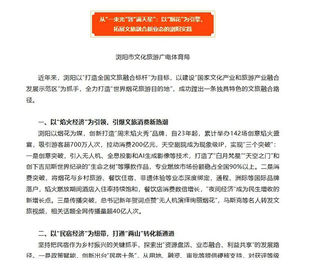 近日,湖南省文化和旅游厅向全省专题推介文旅融合发展典型经验,浏阳凭借“以‘烟花’为引擎、拓展文旅融合新业态”的实践成果,跻身全省仅有的两个县(市、区)代表之列。这一省级认可,标志着浏阳在打造全国文旅融合标杆的征程上迈出了关键一步。