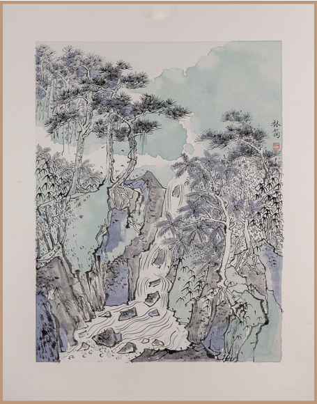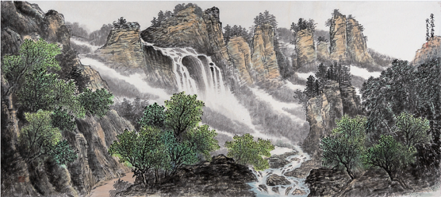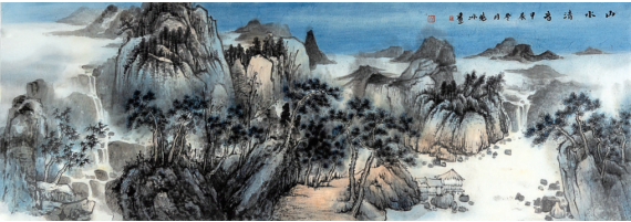 中国画讲究“因情生意,因意待气,借气造形”。观其作《山水清音》,云雾之气氤氲弥漫,山石层层皴染渐显肌理,构图虚实相生,近景林木苍劲,中景山峦叠嶂,远景云雾渺茫,于尺幅之间铺展“咫尺千里”的悠远空间,悄然晕染出“静气”充盈的大美意境。