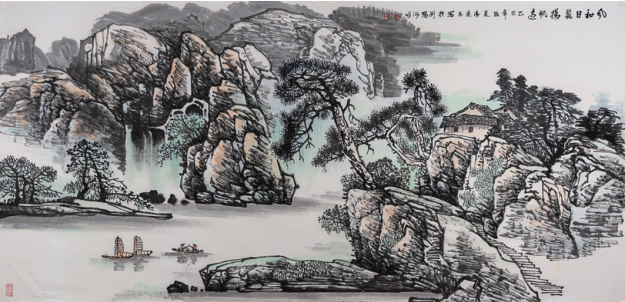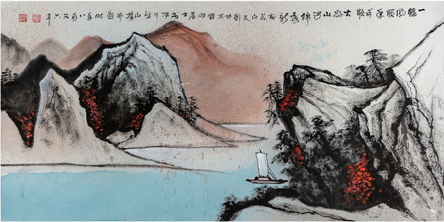 《风和日丽扬帆远》这幅国画作品通过细腻的笔触和丰富的色彩,展现了美丽的自然景象,给人以愉悦的视觉享受。画面中的船只形象寓意着人们勇往直前的精神,也寓示主人事业拓展远方。