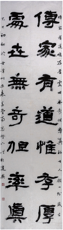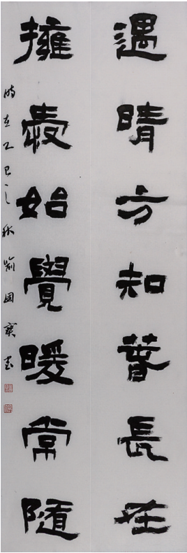 创作感悟:以《张迁碑》为基,融入汉隶其他名碑元素创作此联,需兼顾其方整古拙的本色与多元审美融合。以《张迁碑》为骨,强化核心气质,用笔强调“锥画沙”般的涩劲。最终目标为在《张迁碑》的“雄强”底色上,以其他汉碑元素为“灵韵”,使作品既存古意,又生新趣。