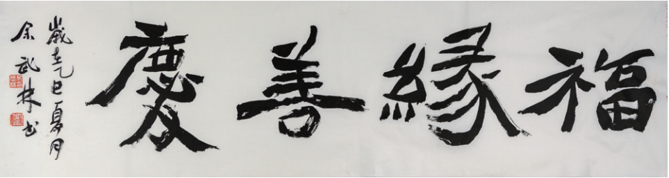 “福缘善庆”四字吉语魏碑大字作品,用笔以中锋为主,逆入藏出,行笔取涩势,沉着含蓄,偶露锋芒,古朴浑厚。其线条粗细结合,苍劲凝练,圆劲饱满。如“长枪大戟”,任笔端弹力恣情纵横,挥洒自如,力运千斤;长亦不厌其长,势来不可遏,势去不可止,开张奇逸,舒展自然,笔势往来,生动至极。