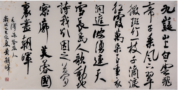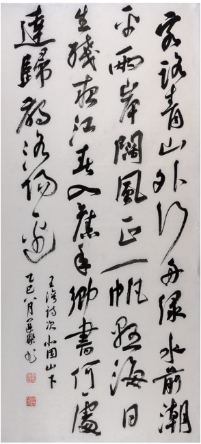 此件书法作品内容为唐朝诗人王湾的《次北固山下》。该诗描写了作者冬末春初在北固山下停泊时所见到青山绿水、潮平岸阔等壮丽之景,抒发了作者深深的思乡之情。全诗用笔自然,写景鲜明,情感真切,情景交融,风格壮美,极富韵致,广为传诵。诗中第三联脍炙人口,不仅写景逼真、叙事确切,而且表现出具有普遍意义的生活真理,给人以乐观、积极、向上的艺术鼓舞力量。作品创作于2025年8月,用半生熟四尺宣纸、红星墨汁书写,以二王笔意进行创作,力求表达一种淳静、典雅的意韵。