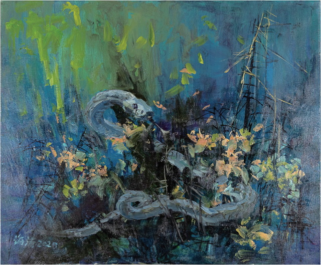 蛇在中国传统文化中被视为智慧的象征。此画是今年乙巳年新春创作,以生肖“蛇”为主题,色调以蓝色为主,增添神秘感,借此表达对属蛇之人的美好祝愿!