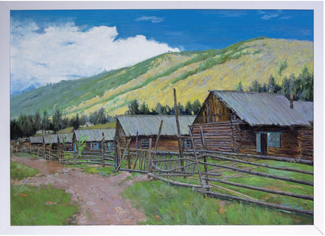 这是一幅描绘牧民生活场景的油画,展现了山间村落、木屋错落、土路延伸,背景山峦色彩丰富,山间树木点缀,蓝天白云映衬,营造出宁静质朴的乡村氛围,生动地呈现了乡村生活场景与自然风光的融合。画家通过对光影、色彩和肌理的运用,注重对自然与生活场景的真实还原。整体风格偏向写实与印象派的结合,通过色彩、构图和细节刻画传递出自然与人文的和谐之美。