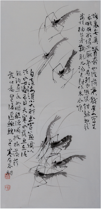 虾的寓意深刻,北方喻其为“龙”,有镇宅吉祥之意,南方喻其为“银子”,取长久富贵之意。此幅画上的虾灵动活泼,栩栩如生,神韵充盈。用淡墨掷笔,绘成躯体,浸润之色,更显虾体晶莹剔透。以浓墨竖点为睛,横写为脑,落墨成金,笔笔传神。细笔写须、爪、大螯,刚柔并济、凝练传神,并辅以咏虾诗词,自认是较为得意之作。