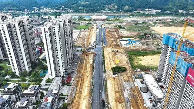 锦程大道(李畋路-浏阳河路段)拓宽工程施工现场图,道路宽度将从21米拓展至120米。