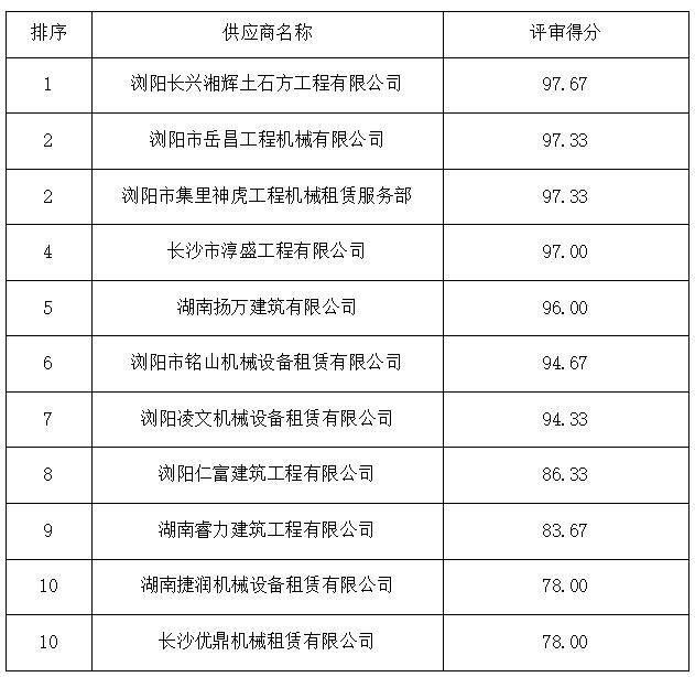 湖南润平项目管理有限公司受浏阳市浏金渣土运输工程有限公司委托,对施工机械设备租赁建库项目进行公开招标。开标、评标于2025年12月12日在浏阳市城乡发展集团有限责任公司2楼202开标室(浏阳市人民东路60号)。评标工作由依法组建的评标委员会完成,评标委员会按照招标文件确定的评标原则和办法,经集体评标,向招标人推荐入库候选人名单如下: