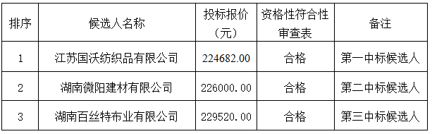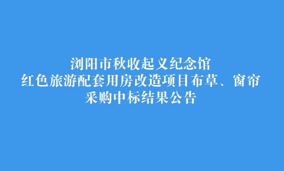 受浏阳市文化旅游产业发展有限责任公司的委托,长沙东睿工程咨询有限公司对浏阳市秋收起义纪念馆红色旅游配套用房改造项目布草、窗帘采购进行公开招标采购,现将采购结果公告如下: